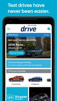 Hyundai Drive is a better way to find the perfect car, because now we can bring the test drive to you, whenever and wherever it’s convenient. It also allows you to control the conversation with dealers and even ask your friends to weigh in. Test drive on your terms: - In certain areas you can Schedule a Pick Up. Select a time and place where you want to test drive a Hyundai and we’ll come to you. Please keep an eye on Schedule a Pick Up vs. Schedule a Visit. We are always adding new locations for Pick Up.